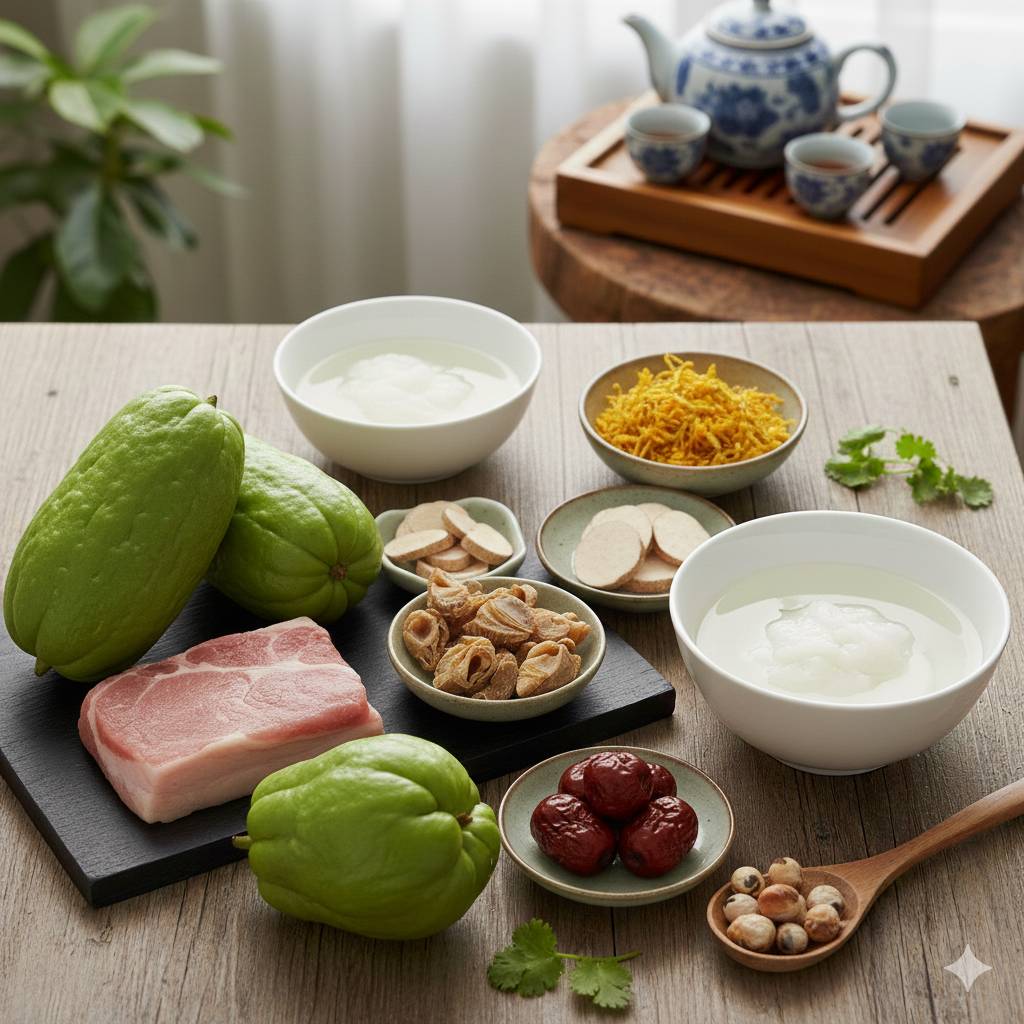 2.瑤柱浸軟,合掌瓜連皮切件。 所有材料加入滾水煲 2-3小時便可。